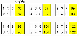 それぞれの数を二乗して足さなくても、各辺の数の和は等しい。