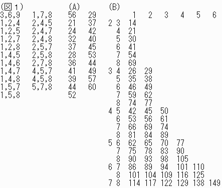 なお余計ですが、各辺の和が等しい配列は、プログラムのM=1として18種類の基本形が見つかりました。