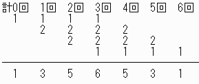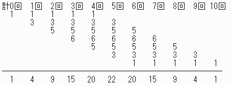 文句の回数 0回 3人の場合の 0回 =1回 1回 3人の場合の 0〜1回の合計 =3回 2回 3人の場合の 0〜2回の合計 =5回 3回 3人の場合の 0〜3回の合計 =6回 4回 3人の場合の 1〜4回の合計 =5回 5回 3人の場合の 2〜5回の合計 =3回 6回 3人の場合の 3〜6回の合計 =1回 N(≧7)回 3人の場合の N−3〜N回の合計=0回これを順次繰り返して