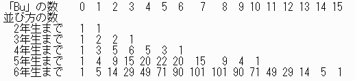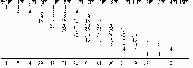 総文句k回の並び方の、左右を逆にすれば、文句15−k回となるので割愛。
