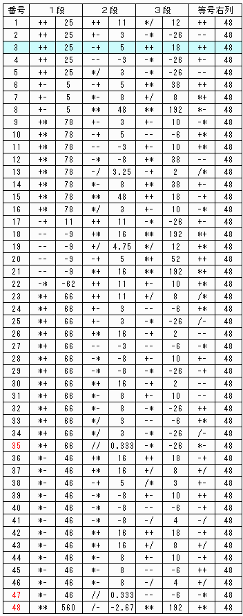 *いろいろな記号で計算した数から、合計で「48」になる組み合わせは、次の通り。
