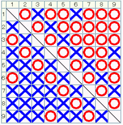 なお、最下位3選手については勝数が最下位選手同士の対戦の勝数の倍である制限を外すと、以下のような勝敗表が可能ですが、題意には合わないようです。\○×××××××