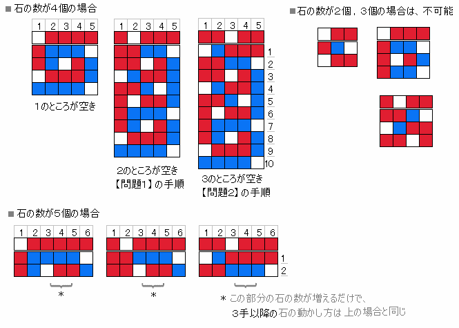 【おまけ1】で、4つの石の場合、空きの位置がどこにあろうと多くとも2手以内で2番目の位置をに空きすることは可能です。