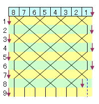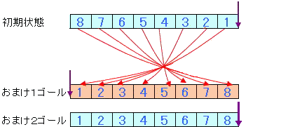 【おまけ1】 下図のように左に2個2個。。。右に1個2個2個。。1個移動を 左右にn回スイープすればカード順は逆転し、かつ矢印は左端に来る。