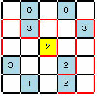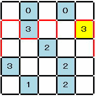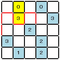 1.左上の0と3が隣り合ってる場所は自明で、次のようなパターンになる。