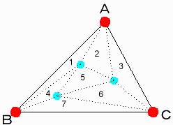 下図のように△ABCの内部にいくつか点を取り、それらの点や△ABCの頂点を結んで、△ABCをいくつかの三角形に分割することを考えます。