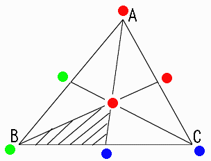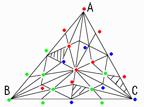 三角形をn回重心分割した後に、問題1と同様に、分割している点の上に、赤、青、緑の3色のボーリングのピンを置きます。