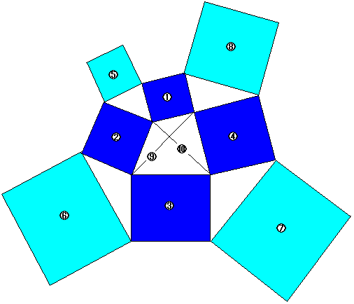 ここで四角形はすべて正方形であり、(9)、(10)は対角線の長さを一辺とする正方形である。