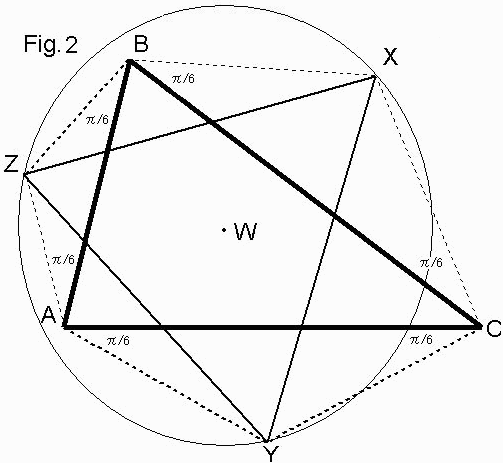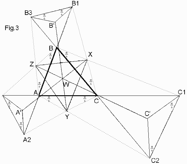 線XA'、YB'、ZC'は1点W(正三角形XYZの外接円の中心)で交わることを証明してください。
