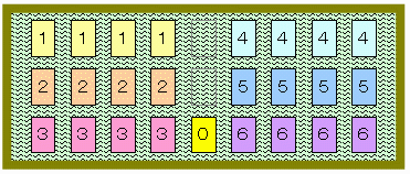 ただし、対戦相手(人間)の癖が分析されており常に、下図のように中央上2段を除く位置に25枚を置き、かつ(1)〜(6)の4枚の各グループ内では公知辞書の辞書引き昇順に左から並べます。