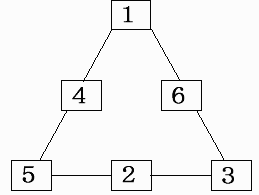 1〜6の数を使って、一辺に並ぶ数の和がすべて等しくなるような三角形を作ります。