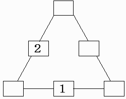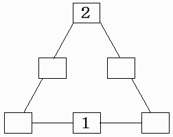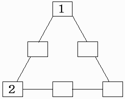 次の三角形に残りの数(3〜6)を一つずつ当てはめて、一辺に並ぶ数の和が等しくなるようにしてください。