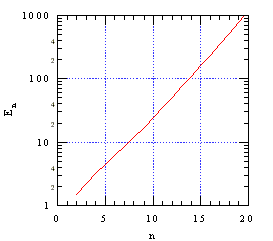 E3=(32+3 E2)/(23−2) = 9/4 = 2.25En のグラフを描いてみました。E4=(33+6 E2+4 E3)/(24−2) = 45/14 = 3.21…