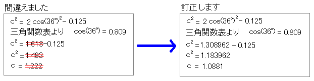 なのはな子さんは、最後にcを求めるときにsinの2乗を忘れていて少しおかしな答えになっていますが (b(正五角形の高さ)はあっているので、間違いがなければc=1.0881...になります)