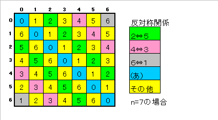 また、n−1行の要素値−1は(2*J+1)mod (n-1)であり、