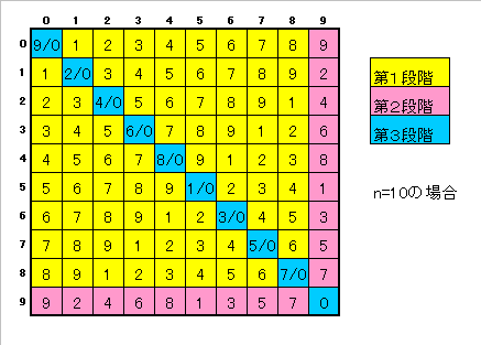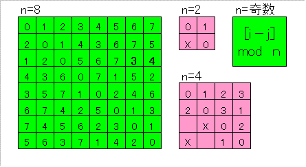 2と奇数n−1は互いに素であるので、要素値は1〜n−1の値を一巡し、(い)には抵触せず、値は0ではない。