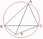 注意:この不等式の関係は円に外接する4角形のトレミーの定理から、等号が成り立つのは点Pが△ABCの外接円上にあるときに限る。