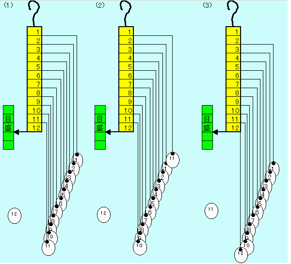 下図は12分の1単位でバネの途中から糸を垂らし、計る方法です。