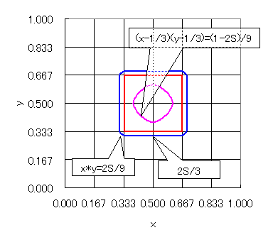 | (1)S≦ | 3 8 | : 角が双曲線の正方形 詳細は図1(青)参照。 |