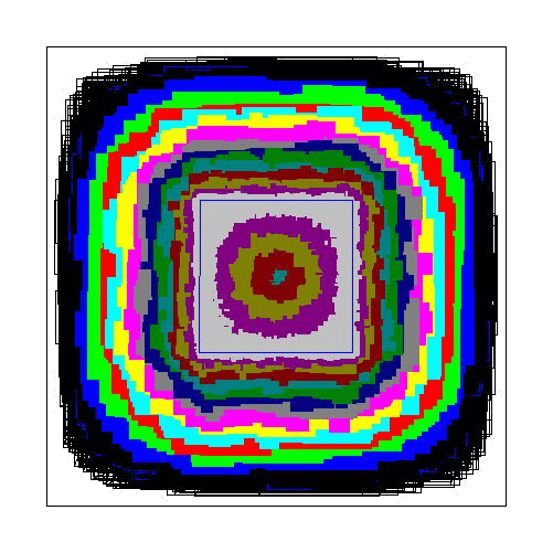 途中で中央に丸い穴があき(茶)、最後に辺長が1/3の正方形の辺上のみとなる。(青線)