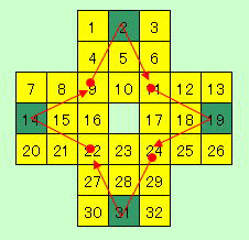 2→11→19→24→31→22→14→9→6→13→25 →32→27→20→8→1→10→3→12→26→17 →5→16→28→21→7→4→15→23→18→29 →30【おまけ1】