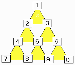 その6つの三角形の「3つの頂点に入った数の和」が全て等しくなるようにしてください。