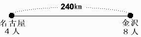 今、金沢に8人、名古屋に4人の人がいるとします。