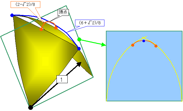 頂点以外の間の部分は対抗する正4面体の辺を含む面(緑)で切断したとき、長い方の円との交点(青)を通り、ルーロ−の面の切断線である円(黄)に接する小円(赤)にしてあります。